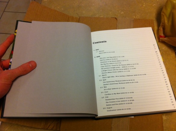 A couple weeks ago, Bryce and I decided to get our family blog printed as a book. We thought this would be a fun family treasure to have and look through and Bryce pointed out that it’s a great piece of family history, too. I’ve been posting on this blog since 2008–tons of stories, memories, milestones, pictures, and special moments recorded on here! Bryce found a program that turned our blog posts into a printable document. There are lots of companies that will do this, but it was hard to find one that could do it with our privately hosted WordPress blog. But, he found one and once that phase was completed, he got the cover and other details formatted to be printed, bound, and shipped to us by Blurb (a printing service). It arrived the other day and we are so pleased with how it turned out!